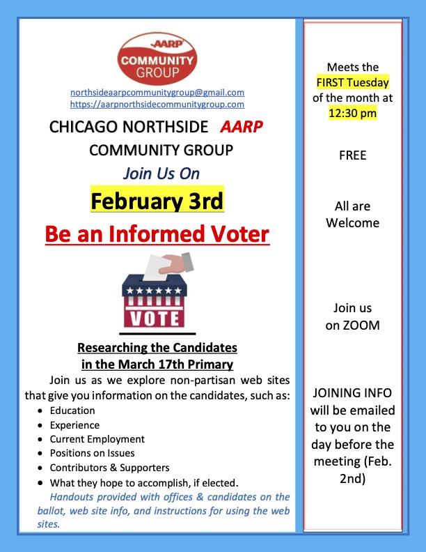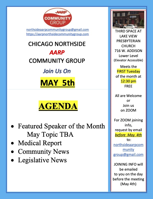 The Northside AARP Community Group’s history goes back to 1982 when a group of seniors got together and formed an AARP Chapter, Lakeview East Chapter #4178 and was chaired by the founding member Sitha Pugh and Beverly Stormont. We work now, as they did then, to enhance the lives of 50+ adults by providing opportunities for learning and social interaction. At this time, we are the only AARP related group on Chicago’s north side. Throughout our history, we have been active in education on topics of interest to seniors: current affairs, community projects, voter education/voter enrollment and health care. In the chapter’s early years we participated in the formation of the senior housing building, Ruth Shirman House. We also focus on the social interaction and engagement aspect of the lives of seniors with events such as neighborhood beautification, musical presentations, day trips and just sharing a meal together. The membership stayed together and formed other types of AARP chapters until today as the Northside AARP Community Group.